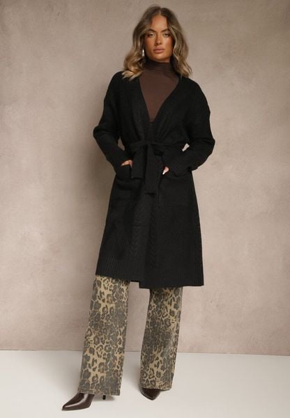 Czarny Tłoczony Kardigan z Wełną o Kroju Bez Zapięć z Paskiem Dorrive