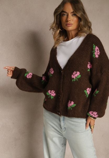 Brązowy Oversizowy Kardigan z Dodatkiem Wełny w Kwiaty Nelenesa