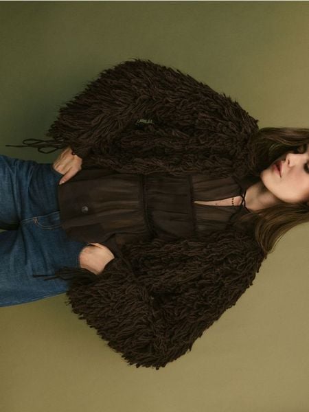 Kardigan o swobodnym kroju, wykonany z dzianiny.