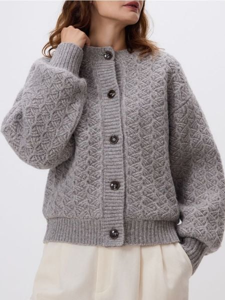 Sweter o swobodnym kroju, wykonany z dzianiny z wełną.