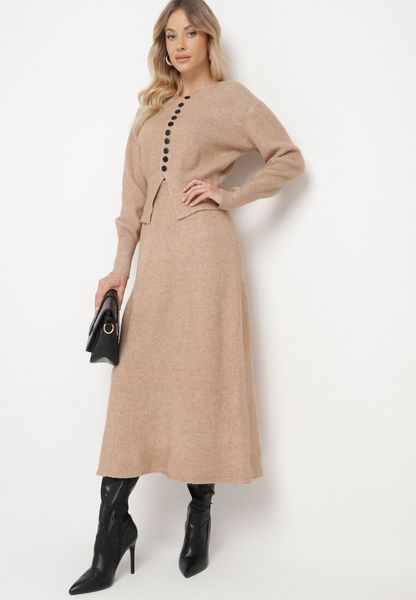 Beżowy Dzianinowy Komplet Kardigan na Guziki i Rozkloszowana Spódnica Zemita