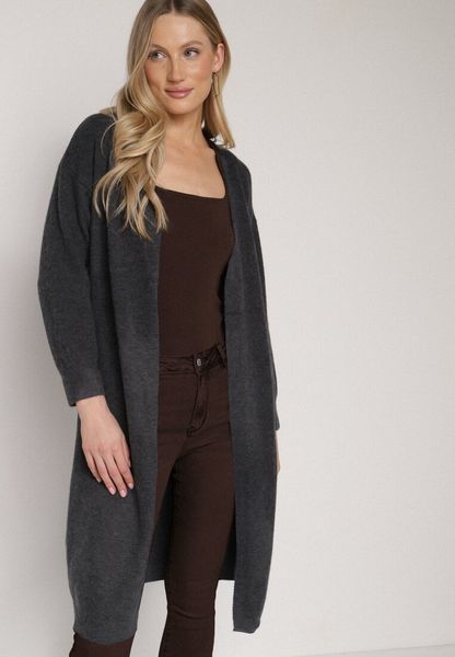 Ciemnoszary Długi Kardigan Bez Zapięć z Dzianiny z Wełną Mevesia