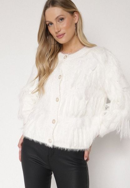 Jasnobeżowy Kardigan z Wełną o Fakturze Imitującej Pióra z Ozdobnymi Guzikami Mevinalia