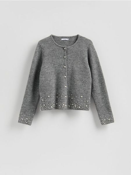 Kardigan o prostym kroju, wykonany z dzianiny z domieszką wełny.