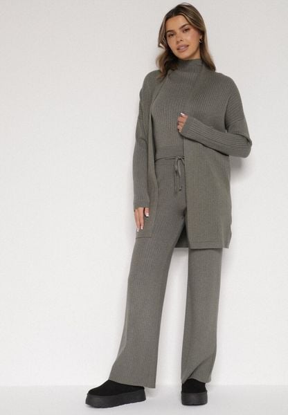 Ciemnozielony Komplet z Dzianiny z Wiskozą Spodnie Bluzka ze Stójką i Kardigan Vetisene
