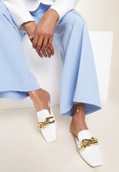 Klapki Jennimere zabudowane z przodu cholewką o lekko nieregularnej krawędzi. Z wysmuklonym, kwadratowym noskiem, wsuwane. Udekorowane grubym łańcuchem w odcieniu złota. Osadzone na płaskim obcasie. Wykonane z ekoskóry. Szukasz klapków przypominających mokasyny lub mule? Te będą strzałem w dziesiątkę!