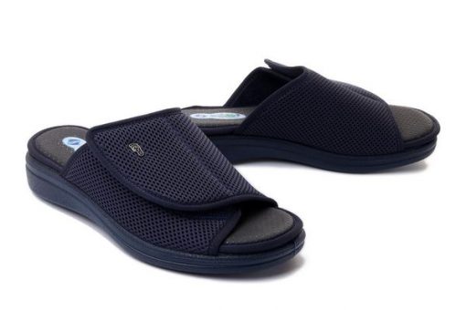 Klapki profilaktyczne damskie. Tekstylna cholewka. Wymienna wkładka mocowana na rzep. Elastyczna podeszwa.