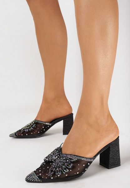 Czarne Siateczkowe Klapki Mule na Słupku w Cyrkonie Belisia