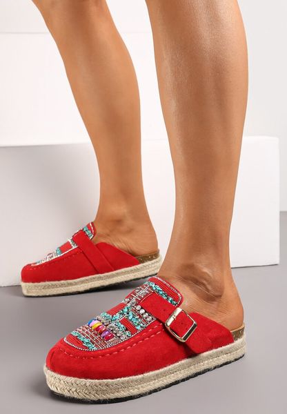 Czerwone Klapki na Plecionej Podeszwie z Kryształkami i Klamrą Noritak
