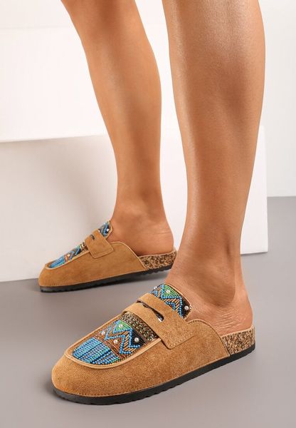 Brązowe Płaskie Klapki z Ekozamszu Zdobione Cyrkoniami i Koralikami Allina