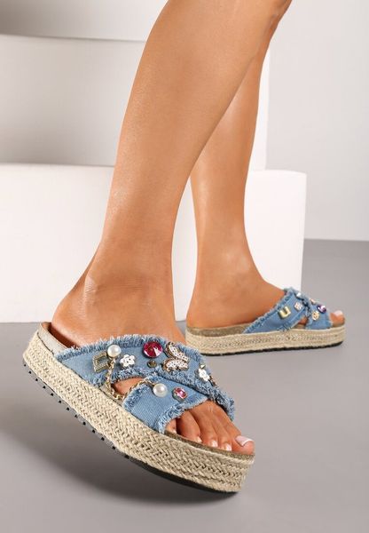 Jasnoniebieskie Klapki na Niskiej Platformie z Plecionki Bogato Zdobione Perłami i Cyrkoniami Ralara