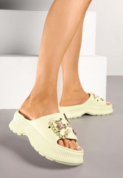 Jasnozielone Piankowe Klapki na Grubej Podeszwie z Ozdobnymi Zawieszkami Isliena