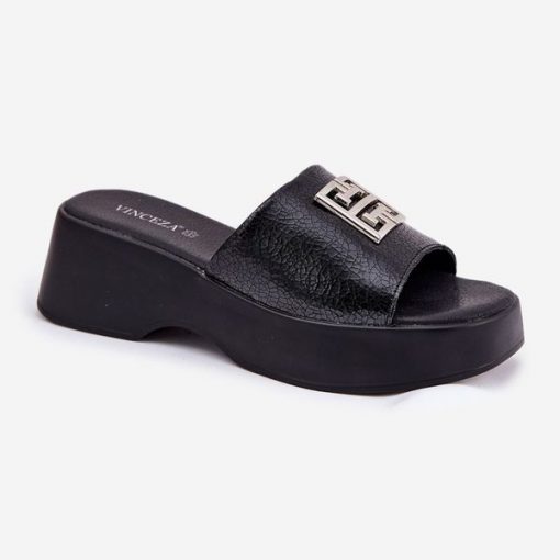 Klapki Na Platformie I Koturnie Z Ozdobą Czarne
