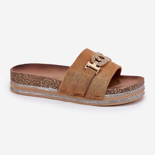 Klapki Damskie Ze Złotym Detalem Na Platformie Z Brokatem Camel brązowe