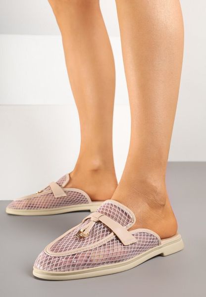 Ciemnobeżowe Klapki Mule z Ażurowej Siateczki Zdobione Elegancką Aplikacją Isvania
