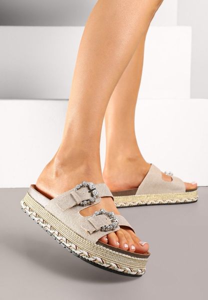 Ciemnobeżowe Klapki na Platformie Ozdobione Klamrami z Cyrkonii Rinalenia