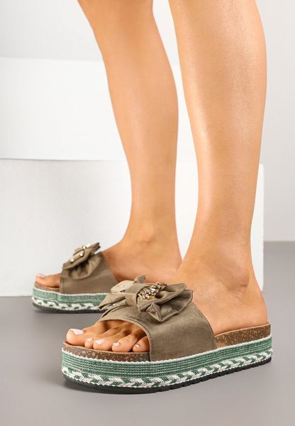 Zielone Klapki na Niskiej Platformie z Ozdobną Kokardą i Aplikacjami Tenaziea