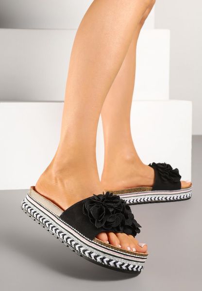 Czarne Klapki na Platformie z Plecionką i Kwiatową Aplikacją 3D Redurise
