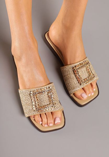 Beżowe Klapki ze Skórzaną Wkładką i Cyrkoniową Klamrą Nurienna
