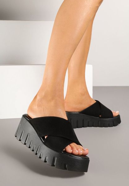 Czarne Klapki na Platformie i Koturnie z Tłoczeniem Adives