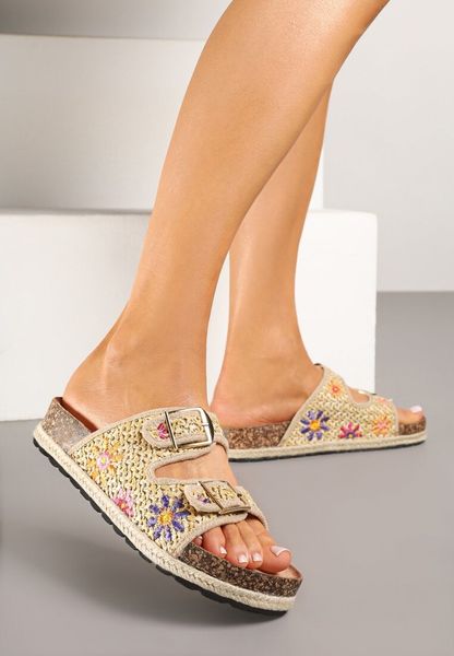 Beżowe Klapki na Krokowej Grubej Podeszwie z Plecionką i Wzorem Kwiatów Wioleira
