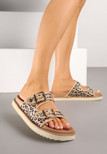 Beżowe Panterkowe Klasyczne Klapki z Paskami z Klamrami Palavenna