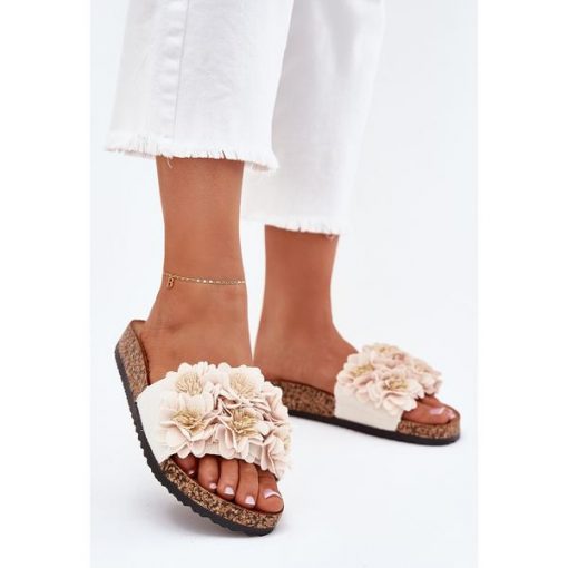 Klapki Damskie Na Korkowej Podeszwie Z Kwiatkami Beżowe beżowy