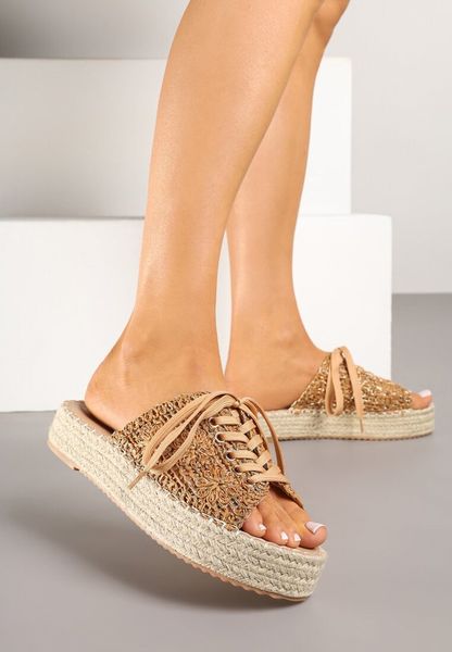 Jasnobrązowe Tweedowe Klapki na Plecionej Podeszwie ze Sznurowaną Cholewką Nevenisse