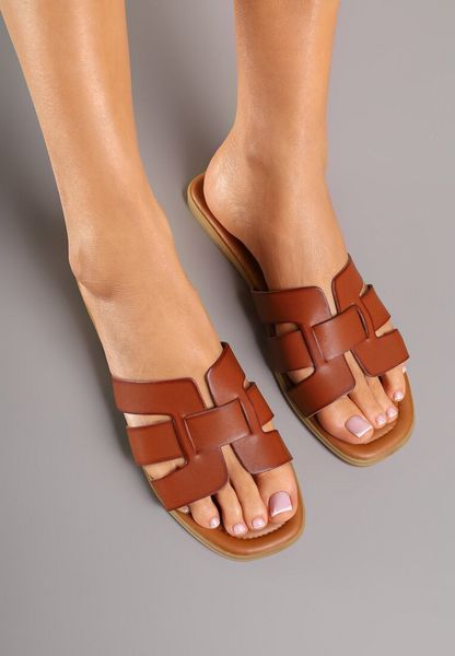 Brązowe Klapki z Przeplatanymi Paskami i Kwadratowym Noskiem Filiela