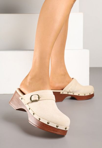 Beżowe Klapki Chodaki na Drewnianej Podeszwie Ozdobione Nitami Galessia