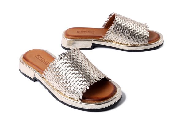 Modny złoty kolor. Skórzana cholewka. Pleciona cholewka. Płaska podeszwa. Wygodne wsuwane klapki.