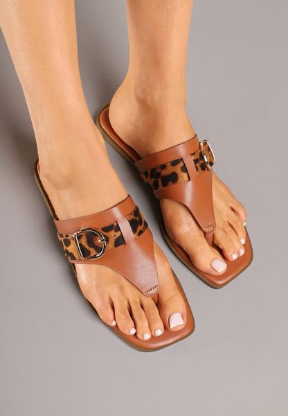 Jasnobrązowe Klapki z Ozdobną Klamerką i Wstawkami Animal Print Savicelle