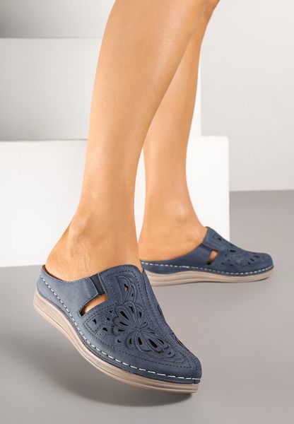 Niebieskie Klapki Na Niskim Koturnie z Ażurowymi Wycięciami i Kwiatem Natalenna