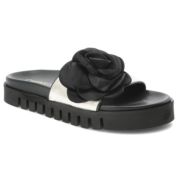 Klapki damskie Chebello, eleganckie skórzane na platformie z kokardą, złoto-czarne, 4647-046