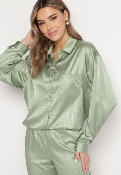 Zielona Satynowa Koszula na Guziki Ozdobiona Paskami z Metalicznej Nici Jovenna