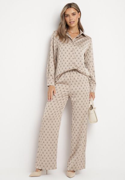 Beżowy Komplet w Geometryczny Wzór Koszula i Spodnie Verikka