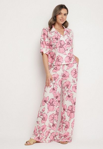 Różowy Komplet w Kwiatowy Wzór Koszula z Krótkim Rękawem i Spodnie Revailise