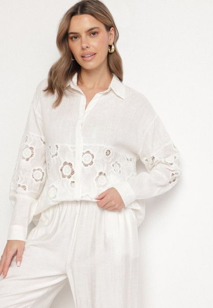 Biała Koszula z Lnem o Kroju Oversize z Ażurowymi Zdobieniami Dannilea