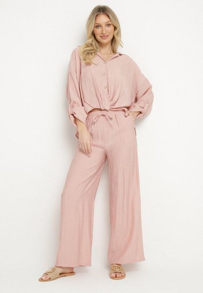 Różowy Wiskozowy Komplet Oversize Koszula i Spodnie z Gumką w Talii Natilira
