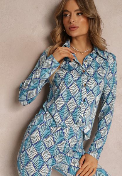 Niebieski Komplet z Wiskozą Koszula i Spodnie Zdobiony Ornamentalnym Printem Elezoria