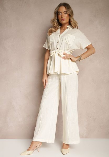 Jasnobeżowy Komplet z Wiskozy o Kroju Oversize Spodnie i Koszula z Paskiem Normell