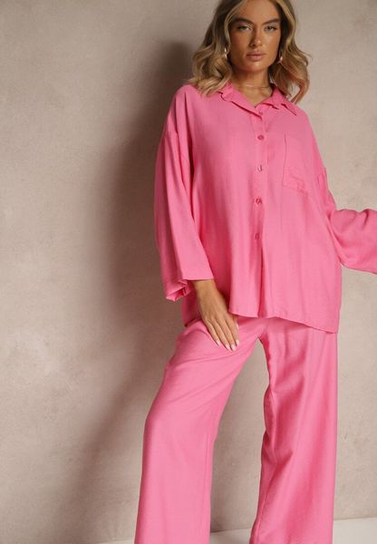 Fuksjowy Wiskozowy Komplet Oversize Koszula i Spodnie Wide Leg Zierana