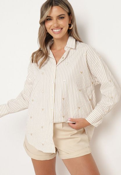 Jasnobeżowa Koszula Bawełniana w Paski z Haftowanymi Serduszkami Sanileni