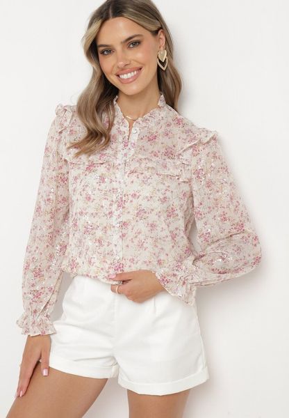 Jasnobeżowa Koszula z Błyszczącymi Drobinkami Falbankami i Wzorem w Kwiaty Vletanna