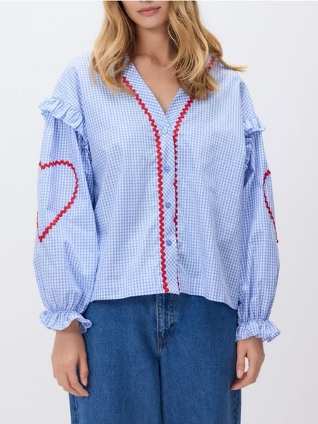 Bluzka o swobodnym fasonie, wykonana z bawełnianej tkaniny.