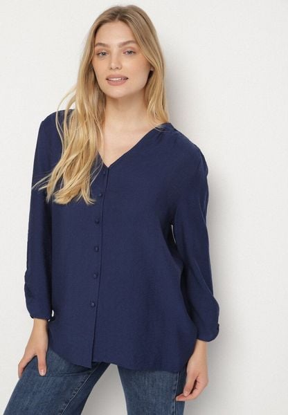 Granatowa Koszula z Wiskozy Ozdobiona Marszczonymi Rękawami i Guzikami Lanorea