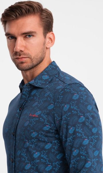Ombre Męska koszula bawełniana z motywem roślinnym granatowa V1 OM-SHCS-0159 S