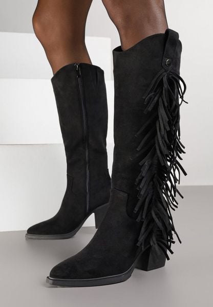 Czarne Kozaki Kowbojki na Obcasie z Cholewką Zdobioną Frędzlami Novera