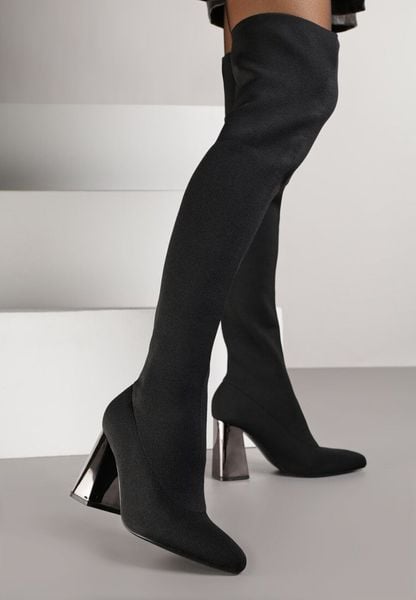 Czarne Skarpetkowe Kozaki Vices za Kolano na Słupkowym Metalicznym Obcasie Nelisela