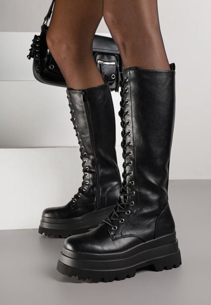 Czarne Sznurowane Kozaki Vices z Imitacji Zamszu na Platformie w Stylu Grunge Lattime